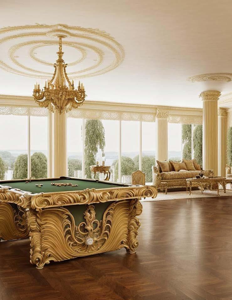 The walls are adorned with contemporary artwork, each piece framed in slim brass that matches the chandeliers above. A small seating area with plush armchairs sits in one corner, creating the perfect perch for spectators to enjoy the games or simply soak in the scenery.