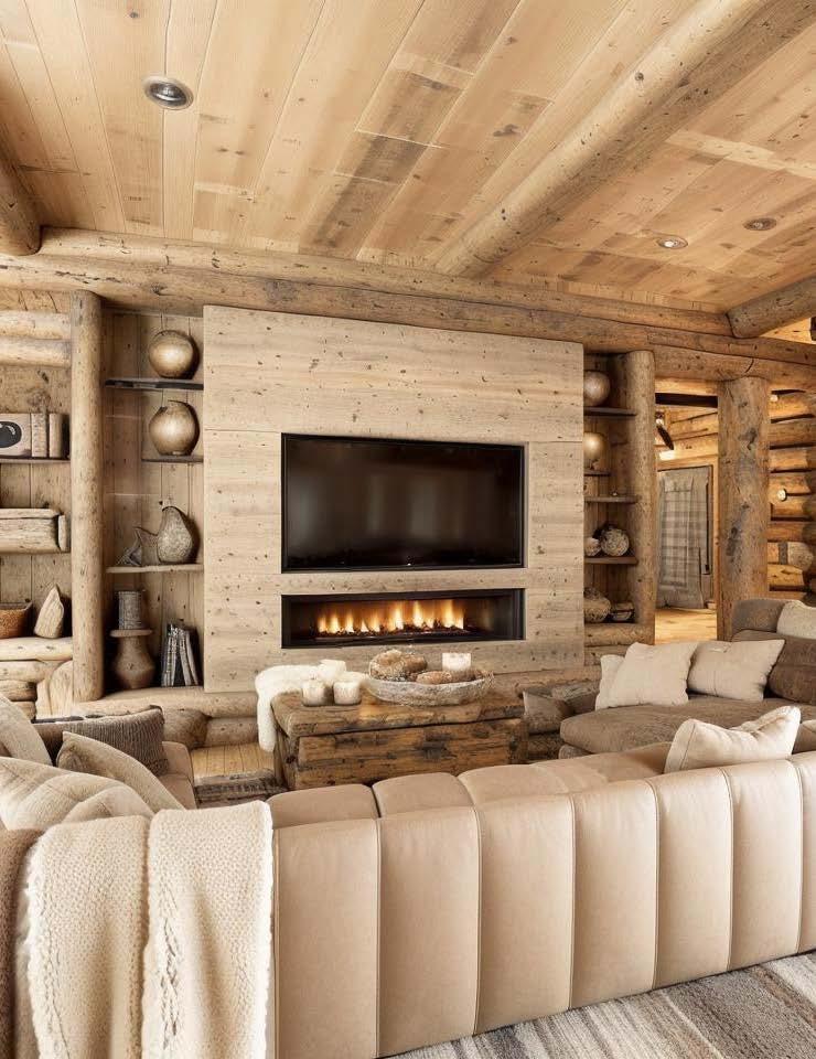 wood built-ins that flank the fireplace, each shelf thoughtfully curated with artifacts, books, and sculptural elements.