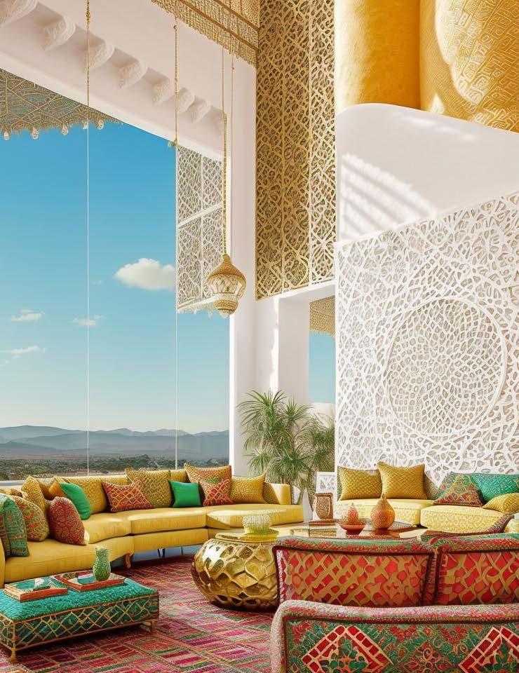 { Moorish Splendor: In another transformation, the walls were adorned with intricate plasterwork inspired by Andalusian courtyards. Deep sapphire textiles and brass accents lent the room a sense of mystery and warmth.