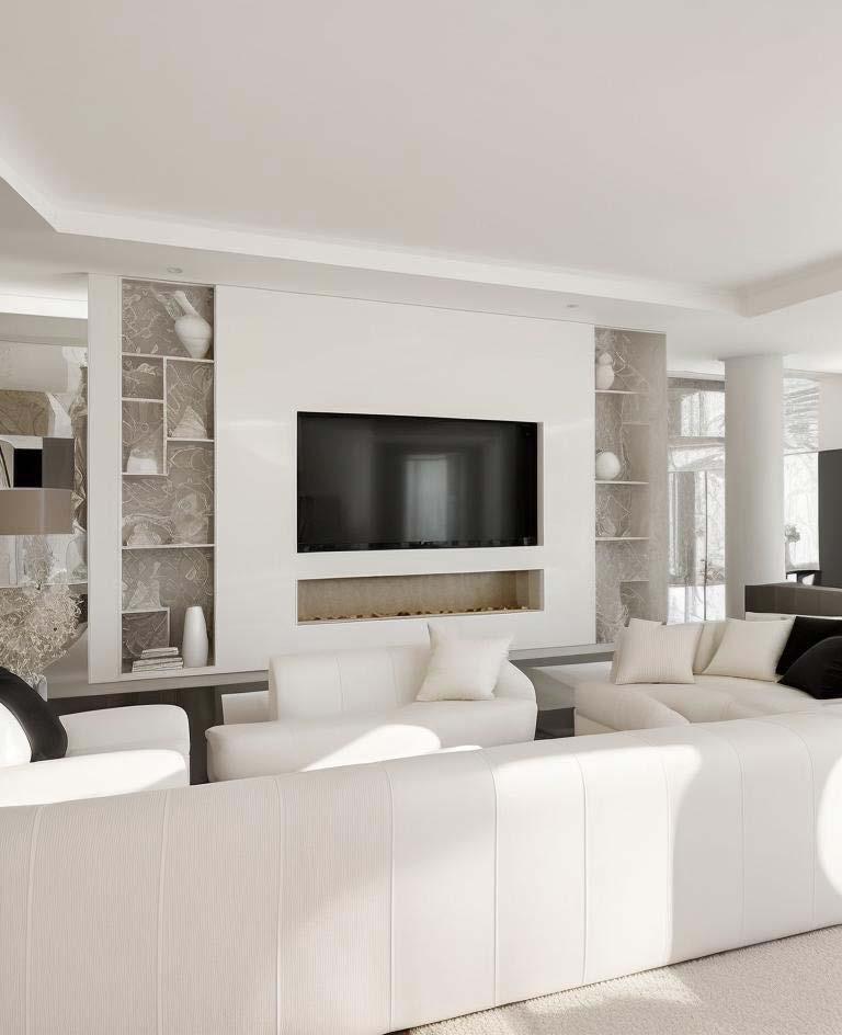 A large, modular sofa upholstered in taupe suede sits at the room’s center, positioned to face a wall-mounted, oversized television. The ceiling follows the home’s architectural language with recessed lighting tracing its perimeter, providing a soft glow that enhances the room’s intimacy.