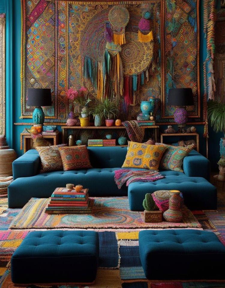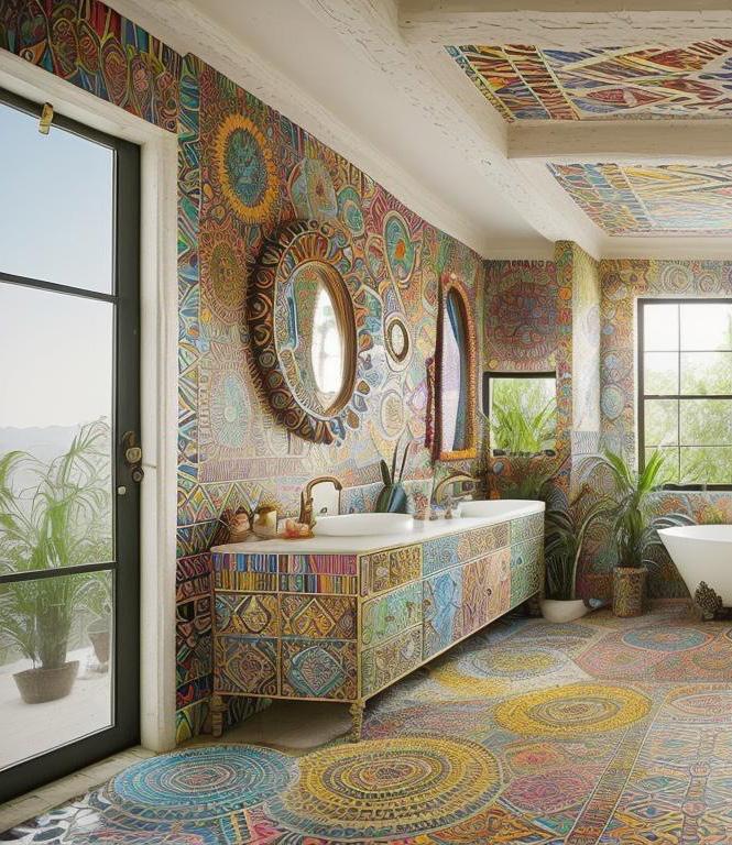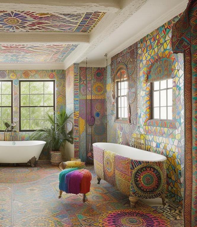 A carefree spirit infuses this space with vibrant patterns and eclectic furnishings, a perfect backdrop for the free-spirited and the artfully inclined.