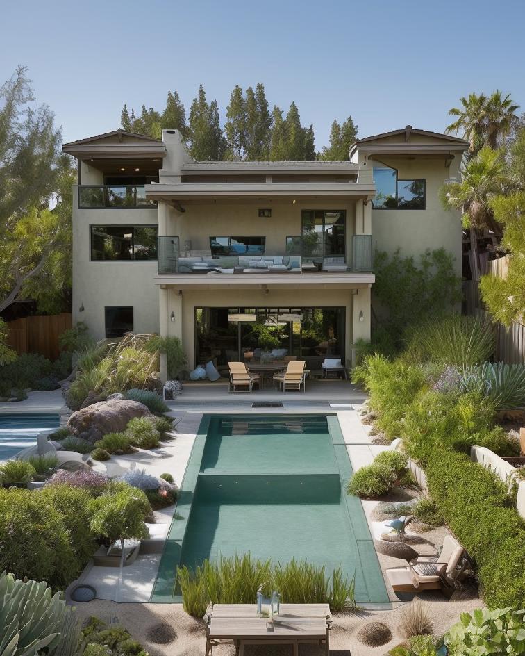 The backyard extends the home’s luxurious feel outdoors. Featuring a pristine pool, comfortable seating areas, and lush greenery, it is the perfect setting for outdoor entertAInment or tranquil relaxation. This space seamlessly blends with the indoor areas, creating a cohesive flow that enhances the home’s overall design.