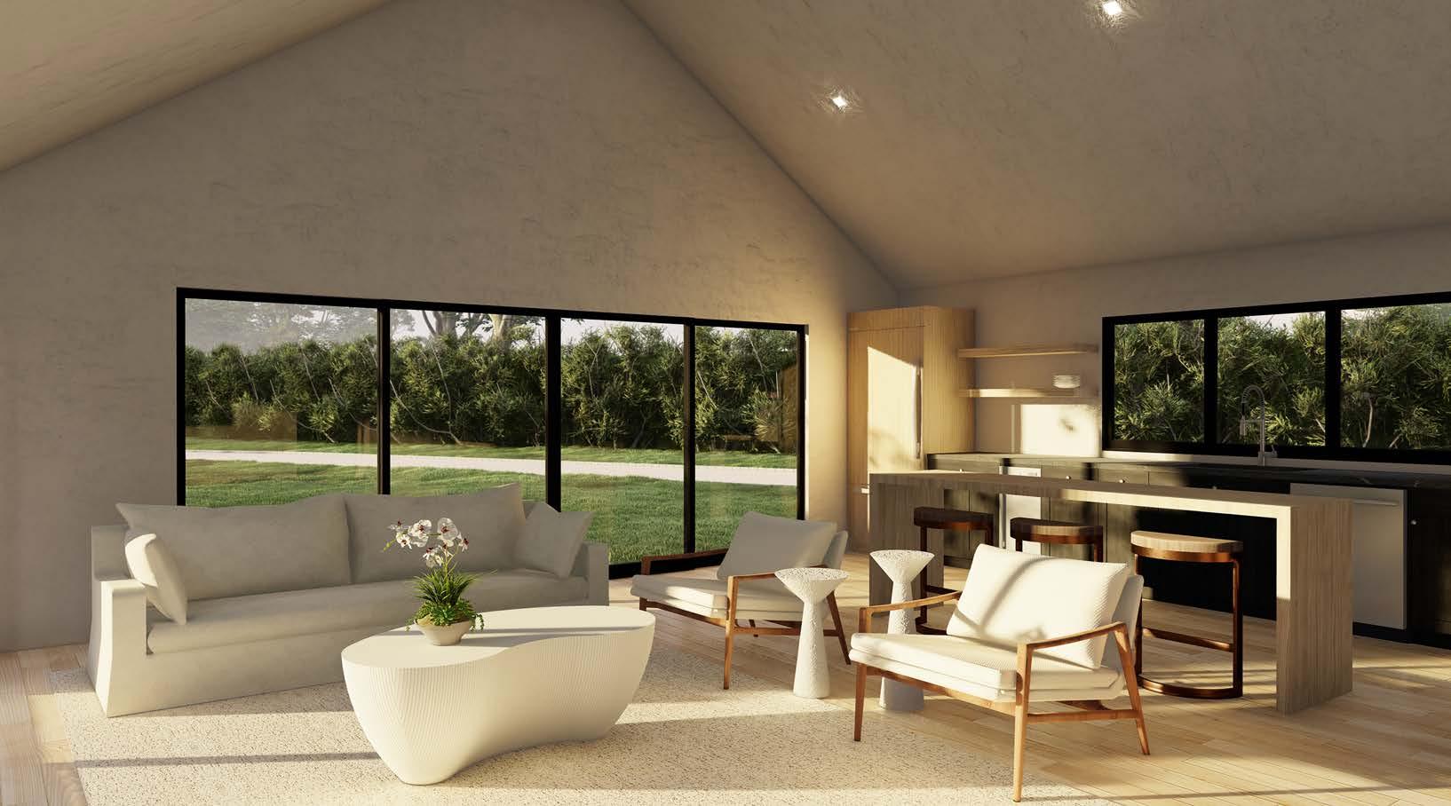 The beautifully restored 1,180 +/- square-foot front barn features cathedral ceilings, exposed beams, polished concrete floors with radiant heat and modern finishes.