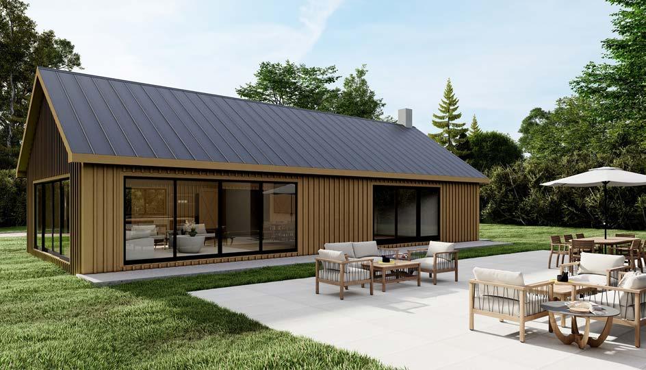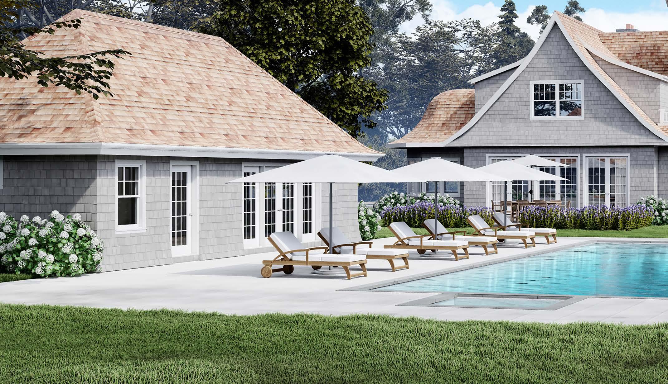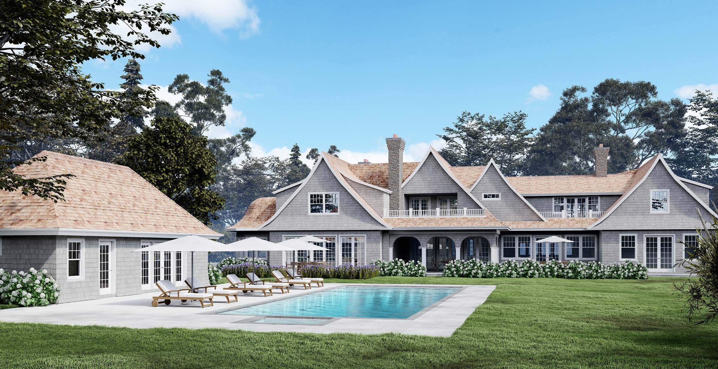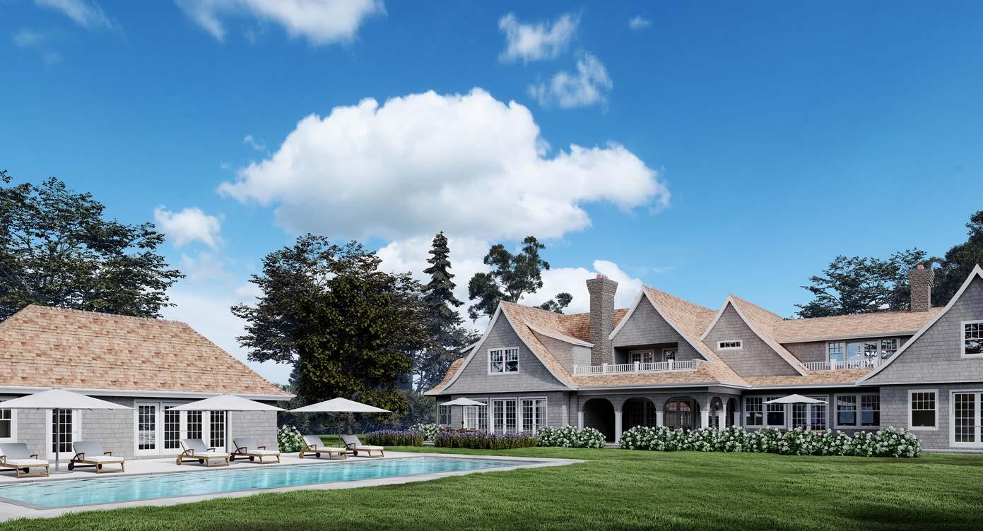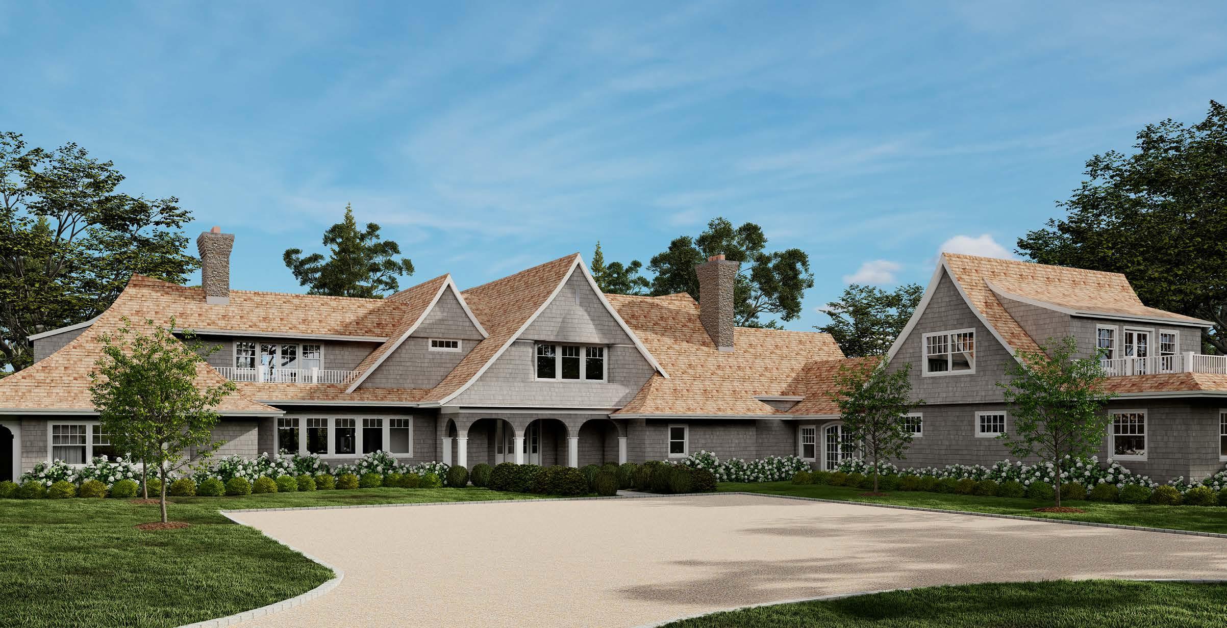 A private entry lane opens up to a striking peaked home with sweeping roof lines, and architecture melding classic Hamptons with transitional features.