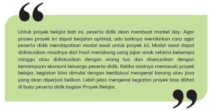 Aktivitas-aktivitas di bab ini bisa dikaitkan dengan pelajaran Matematika (nilai nominal uang, mendemonstrasikan bagaimana uang dipertukarkan untuk mendapatkan nilai manfaat yang dibutuhkan), Bahasa Indonesia (melakukan presentasi, wawancara, mengumpulkan data), dan PPKn (musyawarah dan pembagian tanggung jawab saat proyek belajar).