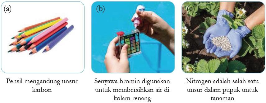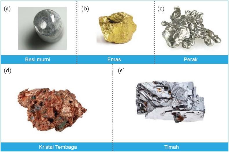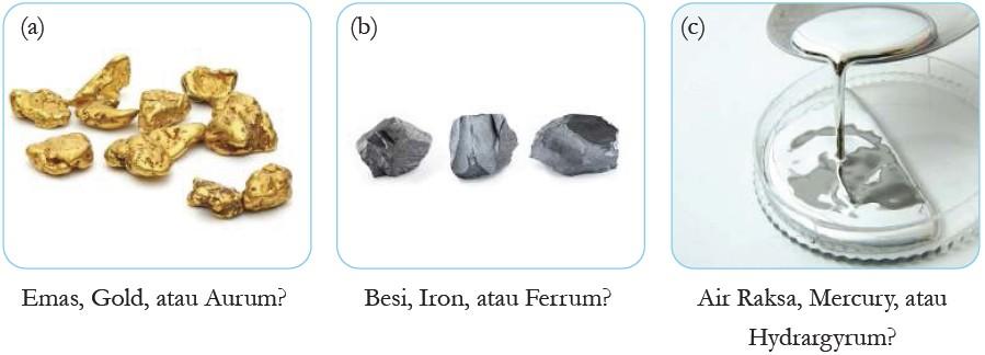 a) Guru dapat memulai pembelajaran dengan membawa beberapa unsur murni ke dalam kelas untuk diamati. Unsur murni dapat berupa logamlogam seperti besi, emas, perak, dan tembaga. Jika memungkinkan, guru juga dapat membawa unsur dalam bentuk cair seperti cairan bromin atau air raksa. Pastikan keamanan tetap terjaga selama zat-zat tersebut berada dalam ruangan kelas. Secara bergiliran murid dapat mendekat dan melakukan penyelidikan terhadap benda-benda yang dibawa. Sebagai pertanyaan pemantik, guru dapat bertanya, misalnya: