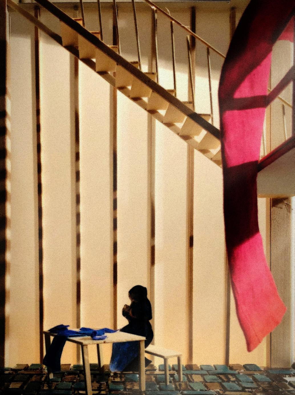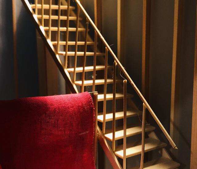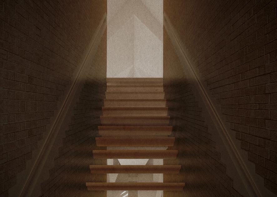The staircase brings you to the bridge as you enter the builing into the dark. The light of the gallery space bleeds through the gaps of the steps, and draws you towards the gallery. The railing sits within the wall.
