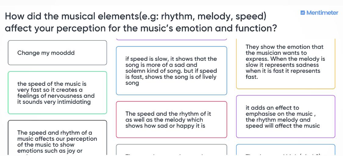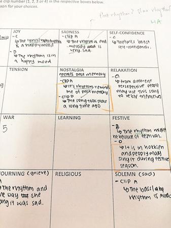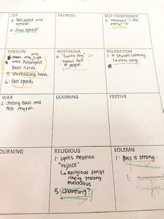 The design of the task was very engaging as could be seen in the students’ participation. With guidance from the teacher, there was visible improvement from the first to the third attempt, and the students were able to hone in on specific sounds they should be listening out for. Her examples and prompting also helped them to explore beyond their typical knowledge of instrument sounds and what they could create. GROUP SOUNDS