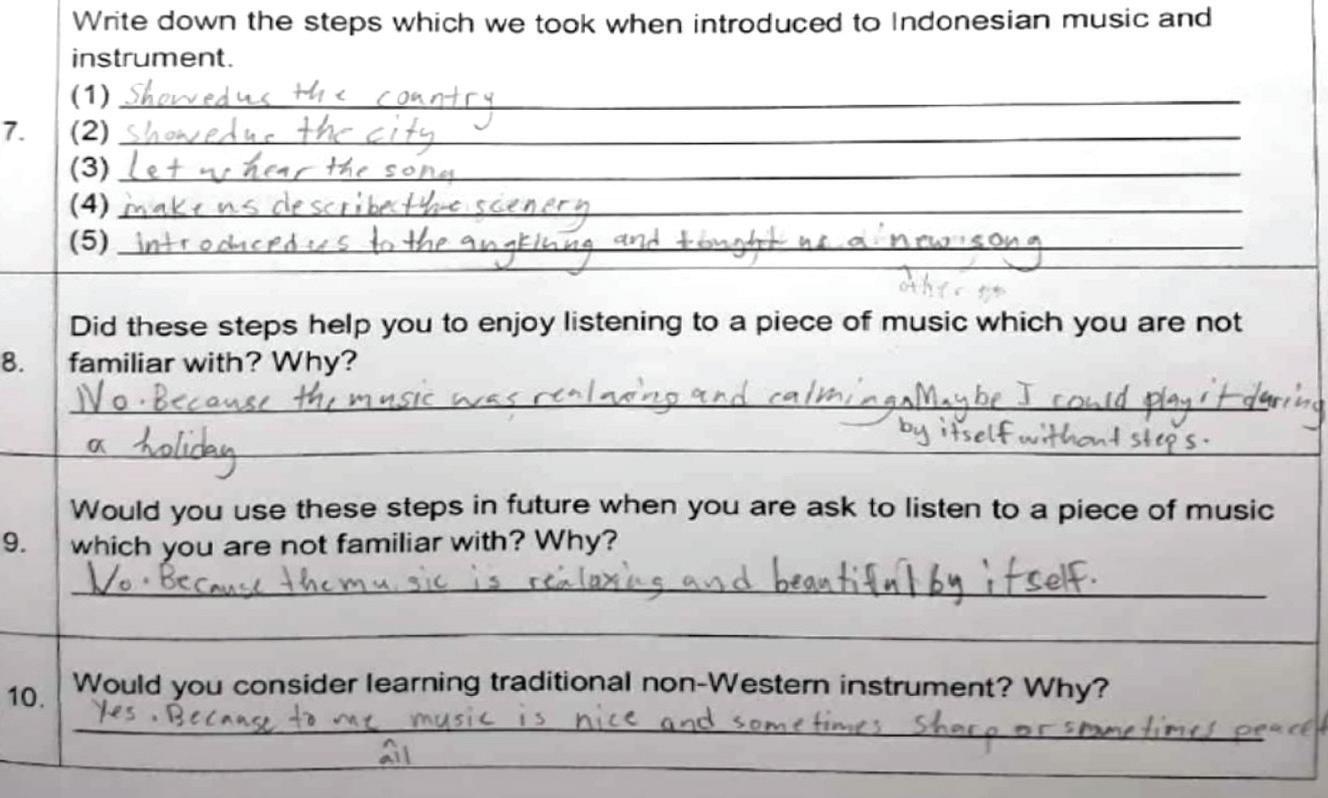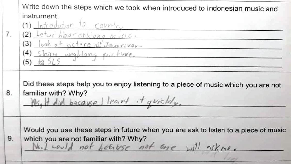 A student shared that he could sense his classmates respecting one another less as the year passed due to friendship matters, highlighting the importance of peer relationships in the cooperation levels in class. He was also pretty insightful and empathetic towards one of the more trouble-giving kids (not during music) who was coping with recent parental divorce. Having had further conversations with the form teachers of the class informally, I realised quite a number of the so-called trouble-making kids do have difficult home situations. This increased my own empathy levels as their teacher while being all the more aware of the need for individualised attention for many of these kids.