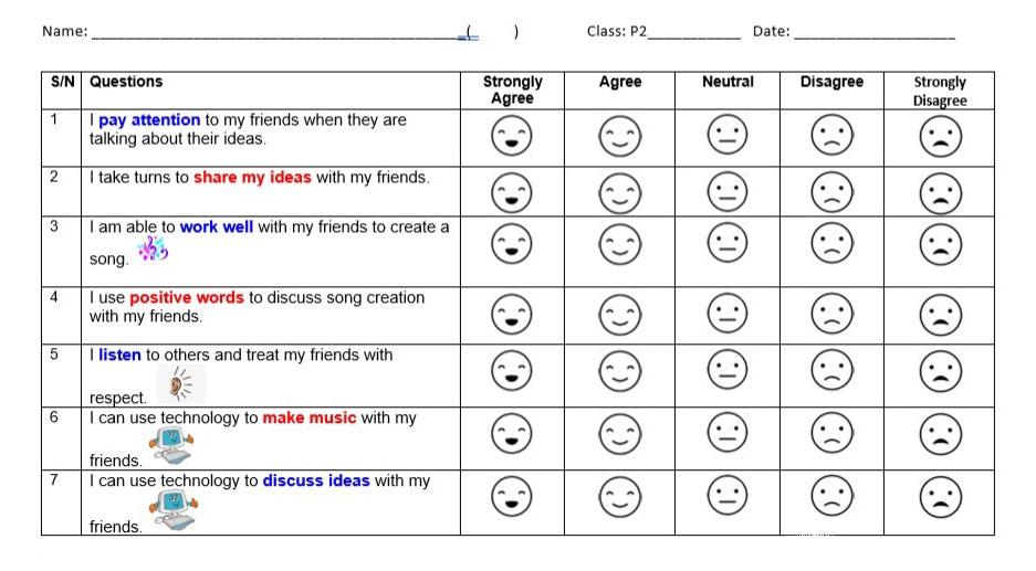 Pre- and post-surveys were conducted after music teachers adapted the questionnaire to make it more inclusive by incorporating smiley faces and words highlighted in colours (as recommended in UDL) to support students with SEN in answering the surveys. This was an intentional move by the teachers to be inclusive. On page 177, is a sample of the pre-survey with coloured highlights for students with SEN. The pre-survey for students without SEN was in black and white.
