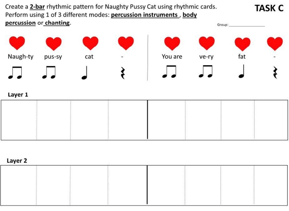 2. Students adapted the tune of “Naughty Kitty Cat”* to compose their song (they have had prior experience in improvising a song) on three animals that are going extinct: shark, polar bear, and elephant). *“Naughty Kitty Cat” is the song “Naughty Pussy Cat" which the students learnt as “Naughty Kitty Cat”