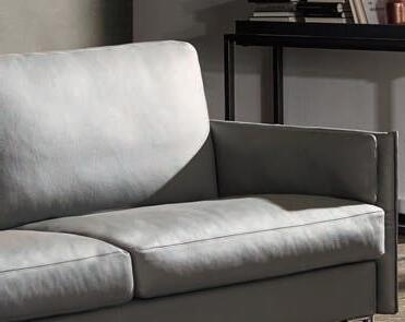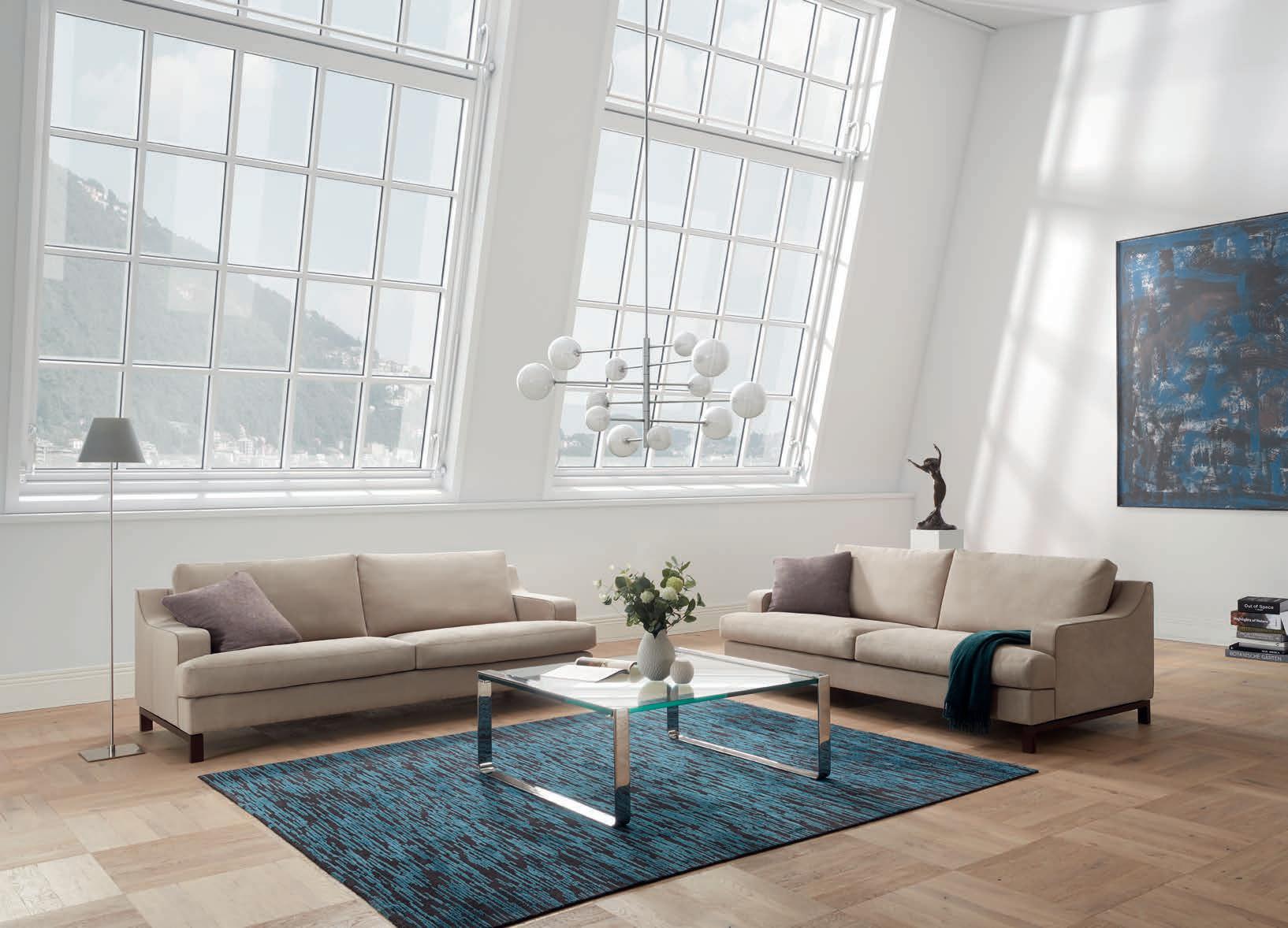 Durch die klare Formsprache wirkt das Sofa modern und zeitlos-elegant, wobei die schräg geklappten Armlehnen dem Design ein offenen, großzügigen Charakter verleihen.