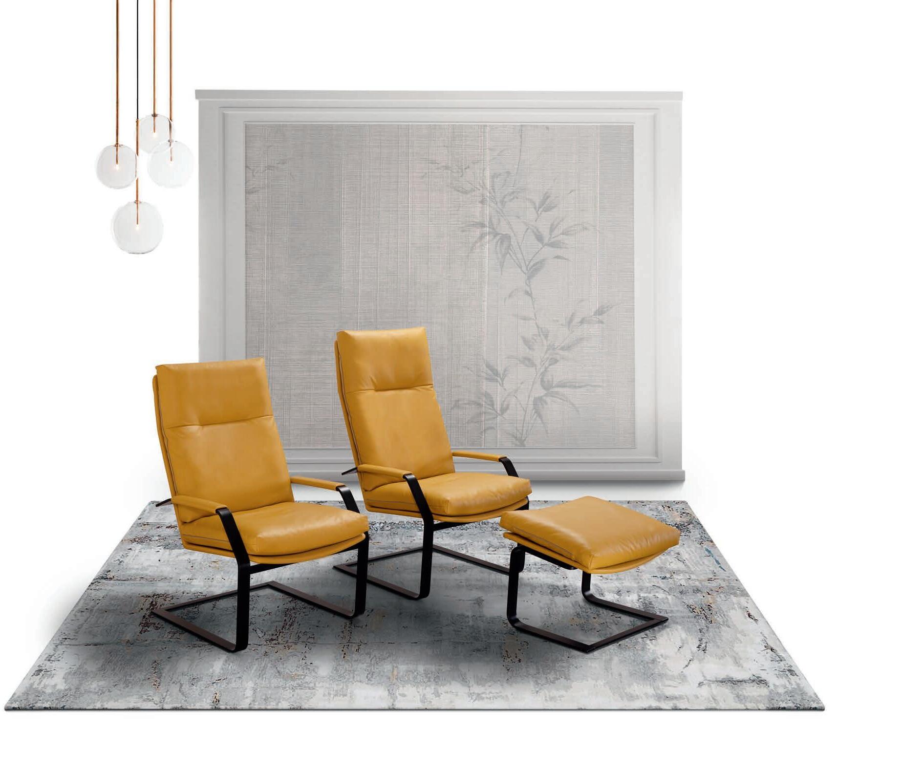 The very idea of a cantilevered armchair is enough to make you feel good, inviting you to sense the easy way the chair yields as you settle. Comfortable upholstery, cushioned armrests, fine materials and a sumptuous feel complete the impression of luxury. Choose from countless combinations of material and leather, then complete the sensation of comfort with a suitable footstool.