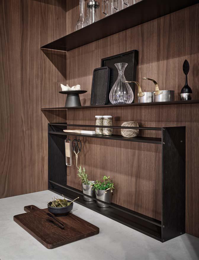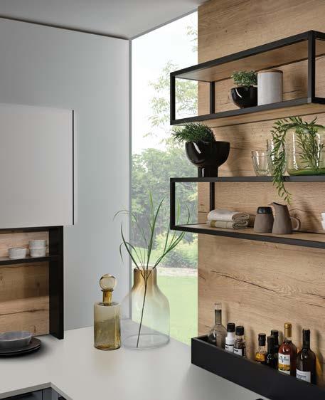 MetallGriffprofilen und den geradlinigen Fronten in einem gedämpften Grünton (RALSonderlackierung). Durch die offenen Regale und Wandborde ist das Küchenmodell besonders einladend, die Kücheninsel mit Sitzgelegenheit fordert zum geselligen Beisammensein auf.