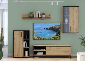 Moderne WOHNWAND, Front und Korpus weiß matt, Absetzungen Eiche Artisan Nachbildung. Bestehend aus: Vitrine, Lowboard und Wandpaneel, B/H/T: 296x201x47 cm. Beleuchtung, Beimöbel, andere Zusammenstellungen zum individuellen Preis erhältlich.