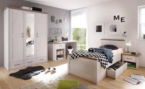 Jugendzimmer, Pinie weiß/Trüffel Nachbildung. Kleiderschrank, 3-trg./1 Spiegeltür, B/H/T: ca. 148x201x62 cm *statt 594.- 369.- Nachtkommode, ca. 51x46x43 cm *statt 148.- 89.99 Schreibtisch, B/H/T: ca. 141x77x81 cm *statt 315.- 199.- BETT, inkl. 1 Lade, LF ca. 90x200 cm, Stellmaß ca. 96x90x205 cm. Matratze und Lattenrost zum individuellen Preis.