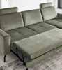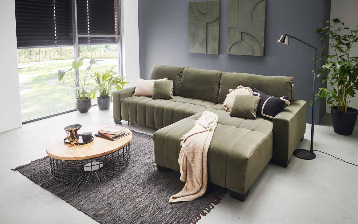 Trendige POLSTERECKE, Stoffbezug in grün, inkl. Bettfunktion, Stauraum und Kissen, Liegefläche ca. 122x242 cm, Stellmaß ca. 277x171 cm. Andere Farben zum individuellen Preis erhältlich.
