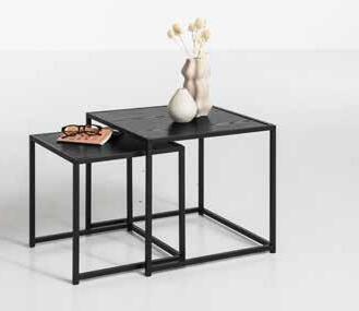 Platte Akazie massiv schwarz lackiert, Gestell Metall schwarz, B/H/T: ca. 42x40x42 cm, ca. 52x45x50 cm und ca. 67x50x72 cm.