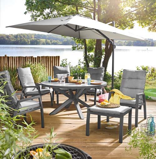 Positionsstuhl, Aluminiumgestell pulverbeschichtet anthrazit, inkl. Kissen, B/H/T ca. 59x109x66 cm Hocker, B/H/T ca. 60x46x51,5 cm