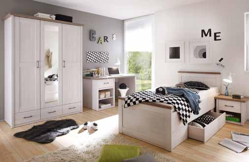 Jugendzimmer, Pinie weiß/Trüffel Nachbildung. Nachtkommode, ca. 51x46x43 cm 89.99 Schreibtisch, B/H/T: ca. 141x77x81 cm 199.- BETT, inkl. 1 Lade, LF ca. 90x200 cm, Stellmaß ca. 96x90x205 cm. Matratze und Lattenrost zum individuellen Preis.