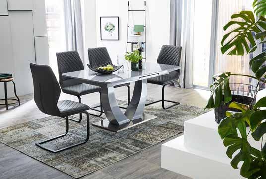 Auszugs-Esstisch, Gestell Hochglanz grau, Glasplatte grau, Fußplatte Edelstahl, ca. 160(200)x90 cm 599.- SCHWINGSTUHL, Stoffbezug Lederoptik grau, Gestell matt schwarz, B/H/T: ca. 47x100x69 cm.
