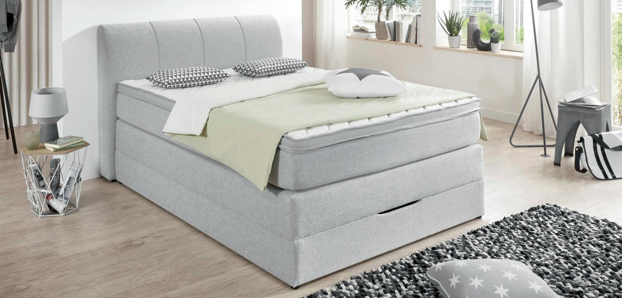 Boxspringbett, Bezug hellgrau, B/H/T: ca. 148x108x218 cm, Liegefläche ca. 140x200 cm, inkl. Topper, ohne Plaid, Bettzeug und Kissen.