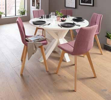 Esstisch, Platte und Gestell weiß Lack matt, Ø ca. 130 cm, ausziehbar von 130 auf 170 cm *statt 793,- 499,- Polsterstuhl, Gestell Buche Natur, Stoffbezug. -52%