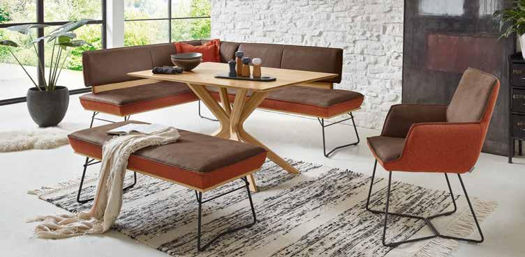 Speisezimmer-Programm, Bezugkombination Leder India muskat und Stoff Loden orangeton, Kontrastfaden beige, Wildeiche natur, Echtholz furniert, W-Kufe Rundrohr Metall pulverbeschichtet, Struktur schwarz-matt. Eckbank, ca. 162x217 cm, ohne Zierkissen *statt 5.597.- 2.899.- Esstisch, Platte und Gestell Wildeiche natur massiv, ca. 140x90 cm *statt 2.644.- 1.299.- Hockerbank, B/H/T: ca. 130x49x54 cm, ohne Decke *statt 1.457.- 799.- Andere Farben und Zusammenstellungen zum individuellen Preis erhältlich.