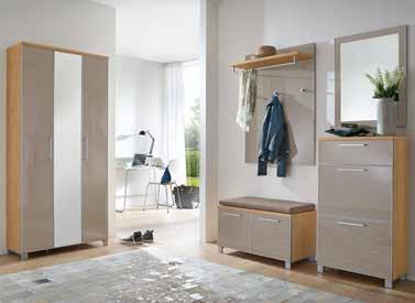 Moderne Garderobe, Korpus Eiche bianco, Glasfront in taupe. 2) Garderobenbank , B/H/T: ca. 84x45x40 cm *statt 554.- 299.- 3) Garderobenpaneel , B/H/T: ca. 80x109x27 cm *statt 455.- 249.- 4) Schuhschrank, B/H/T: ca. 61x108x31 cm *statt 782.- 399.- 5) Spiegel , B/H/: ca. 60x77 cm *statt 252.- 119.- 6) Sitzkissen , B/H/T: ca. 80x4x38 cm *statt 125.- 59.- Andere Farben und Zusammenstellungen zum individuellen Preis erhältlich.