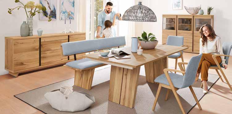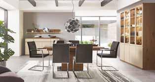 Modernes Speisezimmer, in Eiche rustico hell furniert, geölt, gebürstet und. Beleuchtung, Spiegelrückwand, Holzuntergestell, andere Farben und Zusammenstellungen zum individuellen Preis erhältlich. Sideboard, B/H/T: ca. 206x77x43 cm *statt 2.556.- 1.399.- Highboard, B/ H/T: ca. 187x145x43 cm *statt 4.157.2.299.- Speisetisch, ca. 190x100 cm *statt 2.556.- 1.399.- Klappeinlage gegen Mehrpreis. EINZELBANK , ca. 200 cm, Stoffbezug in hellblau. Stuhl, Stoffbezug in hellblau *statt 780.- je 429.-