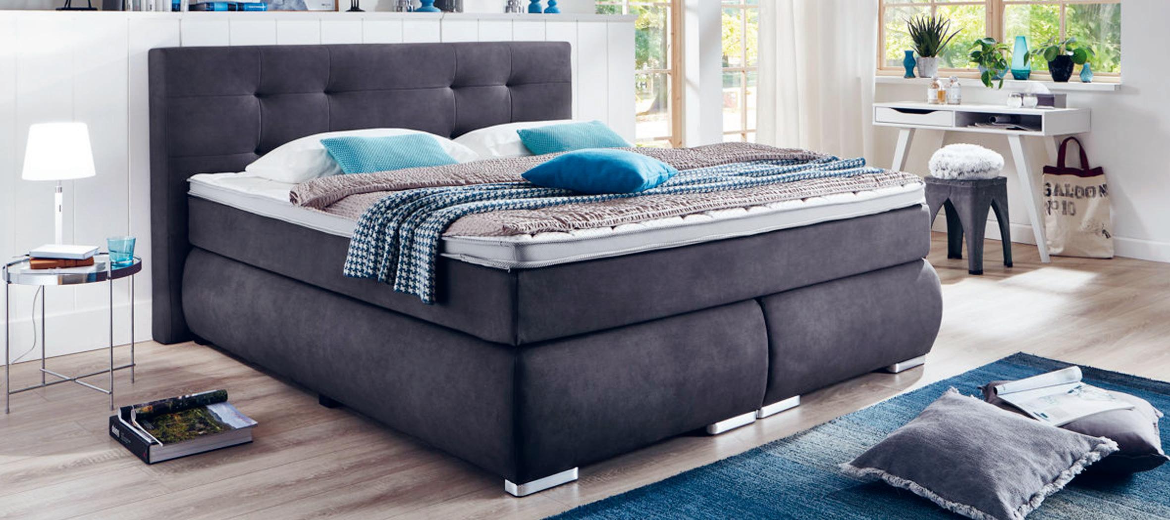 BOXSPRINGBETT, Bezug anthrazit, B/H/T: ca. 200x110x214 cm, wendbare Matratze H2/H3, Liegefläche ca. 180x200 cm, inkl. Topper. Ohne Plaid, Bettzeug und Kissen.