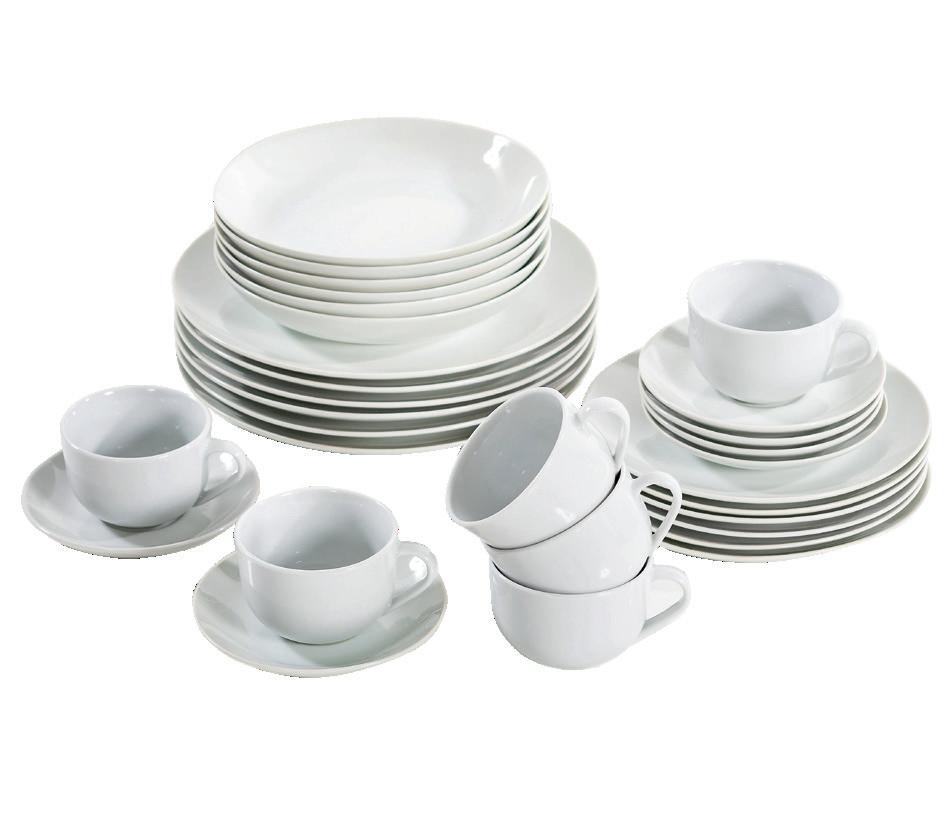 best. aus: je 6 Teller flach, Teller tief, Dessertteller, Obertassen und Untertassen, aus weißem Porzellan.