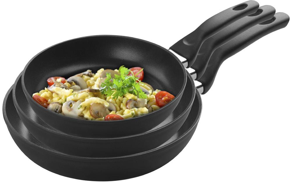 Praktisches PFANNEN-SET, 3-tlg., Aluminium, für alle Herdarten geeignet, außer Induktion, best. aus: 1x Ø 20 cm, 1x Ø 24 cm und 1x Ø 28 cm.