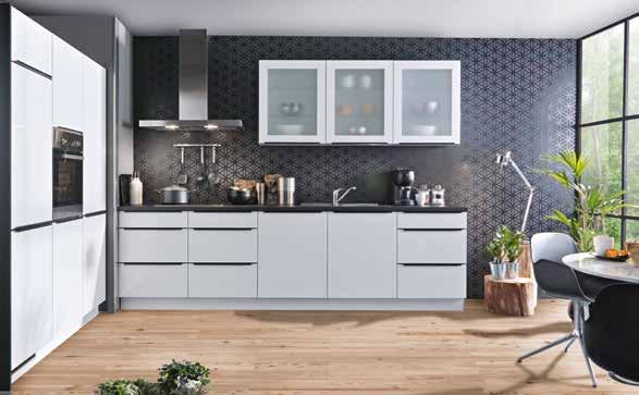 Moderne EINBAUKÜCHE in schwarz mit Fronten in weiß Hochglanz oder weiß matt mit Anti Fingerprint, ca. 180 + 300 cm, inkl. Elektrogeräte-Set und Einbauspüle. Geschirrspüler, Relingset und Armatur gegen Mehrpreis. Andere Größen, Farben und Zusammenstellungen zum individuellen Preis planbar.