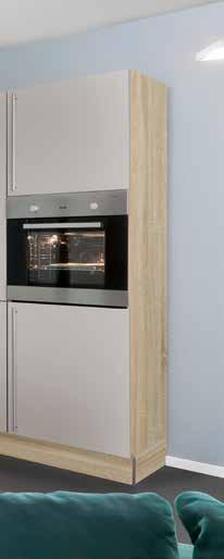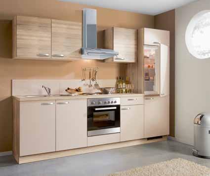Moderne KÜCHENZEILE in Bergeiche Nachbildung mit Absetzungen in Crema B: ca. 270 cm inkl. Elektrogeräte-Set und Einbauspüle. Geschirrspüler, Nischenpaneel, Relingset und Armatur gegen Mehrpreis. Andere Größen, Farben und Zusammenstellungen zum individuellen Preis planbar.