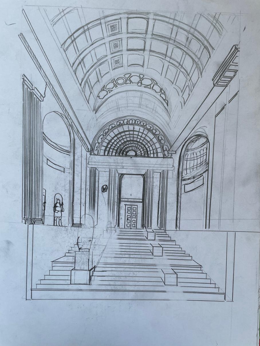 Multiple-point perspective, on the other hand, is a technique that use more than two vanishing points to portray space in a more complicated manner.