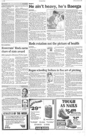 duns in October, Regan called information helps, You can try it and it can tell you ~~ Cleveland to see if they would what not to do." - I be interested in having him Regan admits he doesn't have all the answers, but .".,' the 62-year-old has 13 years of experience as a majorback. " Regan had left Cleveland at- league pitcher and another 25 as a coach or manager. ter the strike-shortened 1994 "He really knows what he's talking about," said season to become the Balti- Steve Karsay, currently slotted to be a long reliever ` more Orioles' manager.Under for the Indians, "And sometimes it's just the little / Regan's tutelage in '94, the In- things he might notice. That's what it was with me, _ dians led the majors in com- just something with my mechanics that didn't require L plete gasmues, allowed the few- a big adjustment." est home rums and had to only Regan says he missed the teaching aspect of Phil Regan AL staff with four pitchers who coaching while managing the Orioles in '95. There won 10 or more games. were too many times, he said, when he felt like he Regan, who spent the past two seasons as pitch- was standing around doing nothing. i ng coach of the Chicago Cubs, was eager to be on But now Regan,a grandfather of 10,is back where Indians manager Mince IIargrove's staff again. he belongs. "We worked together well," Regan said. "And I "You kind of live and die with your pitchers," he knew they had some good young pitchers and they said."You feel bad when they feel bad, and you feel were a team with a good chance of winning the good when they feel good: But when you get them World Series. To me it was an ideal situation." over those humps it's real rewarding." Regan's hands-on approach is a departure from the way Wile; 2110ME,ihALPPY — Jim Thome, Travis Fry"Working with a new pitching coach is an adjust- man and rookie Alex Ramirez homered as the meat, but it's been real easy to get a feel for what Phil Indians totaled 12 hits in a 10-2 win over the Los is talking about," Wright said. Angeles Dodgers in Vero Beach,Fla. "With Mark it was more,`Come to me if you need Dave Burba of Cleveland allowed six hits and something.'Or he'd let you know if he saw something two runs in five innings. Karsay finished with onedrastic. Phil's got a lot of information. Even bad hit relieffor a save.