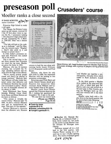 The Vikings, the Division I state unner-up last season, received 22 f the 37 first place votes to capure the No. 1 preseason ranking 1 The Enquirer's high school foot·all poll, outpointing No. 2 Moel:r, 338-330. Elder was a distant hird. "The kids will look at the ranklg as a challenge," said Pat Manuso, the veteran coach. "Hopeful~ y, they'll take pride ~n it and ttempt to remain there." · In USA. Today's preseason naional poll, Princeton was ranked .2th in the nation. This is the second time in the •ast three seasons that Princeton vas voted the top team. Moeller vas given the honor in 1991. Mancuso, who has 14 starters ·eturqing, has re-tooled the Vijngs' punishing defense and. tin:ered with the high octane offense. "We've moved several people tround and they'll be playing in •trange positions," Ma_ncuso said. 'josh Johnson will play inside line>acker rather than defensive end md Rashawn. Hutchins has moved rom cornerback to safety." Hutchns was an honorable mention all:ity player iq1990: .. jason· Whitehead, ·Sam Young, )hondale Wolfork,. Corey· Glass, \aron Bozan and Brian Keeton are tlso back on defen'se . ·. "This season is virtually the ·everse of last," Mancuso said. "In l990, we had a veteran offensive :earn and an inexperienced de·ense. This year, it's the opposite." Despite Mancuso's concerns tbout the offensive· unit; Houston
