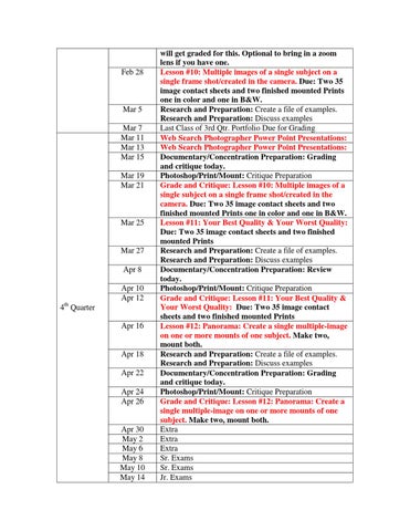 will get graded for this. Optional to bring in a zoom lens if you have one. Lesson #10: Multiple images of a single subject on a single frame shot/created in the camera. Due: Two 35 image contact sheets and two finished mounted Prints one in color and one in B&W. Research and Preparation: Create a file of examples. Research and Preparation: Discuss examples Last Class of 3rd Qtr. Portfolio Due for Grading Web Search Photographer Power Point Presentations: Web Search Photographer Power Point Presentations: Documentary/Concentration Preparation: Grading and critique today. Photoshop/Print/Mount: Critique Preparation Grade and Critique: Lesson #10: Multiple images of a single subject on a single frame shot/created in the camera. Due: Two 35 image contact sheets and two finished mounted Prints one in color and one in B&W. Lesson #11: Your Best Quality & Your Worst Quality: Due: Two 35 image contact sheets and two finished mounted Prints Research and Preparation: Create a file of examples. Research and Preparation: Discuss examples Documentary/Concentration Preparation: Review today. Photoshop/Print/Mount: Critique Preparation Grade and Critique: Lesson #11: Your Best Quality & Your Worst Quality: Due: Two 35 image contact sheets and two finished mounted Prints Lesson #12: Panorama: Create a single multiple-image on one or more mounts of one subject. Make two, mount both. Research and Preparation: Create a file of examples. Research and Preparation: Discuss examples Documentary/Concentration Preparation: Grading and critique today. Photoshop/Print/Mount: Critique Preparation Grade and Critique: Lesson #12: Panorama: Create a single multiple-image on one or more mounts of one subject. Make two, mount both. Extra Extra Extra Sr. Exams Sr. Exams Jr. Exams