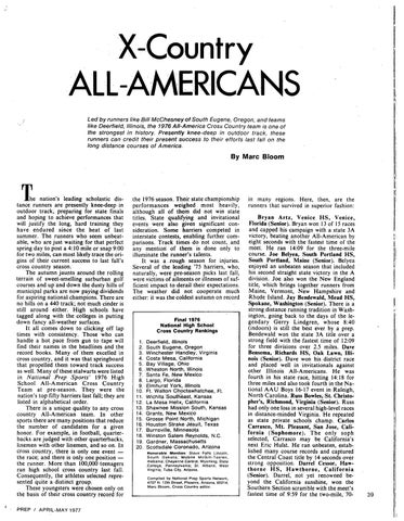 . l e nation's leading scholastic dis-. tance runners are presently knee-deep in outdoor track, preparing for state finals and hoping to achieve performances that will justify the long, hard training they have endured since the heat of last summer. The runners who seem unbeatable, who are just waiting for that perfect spring day to post a 4: 10 mile or snap 9:00 for two miles, can most likely trace the origins of their current success t<i last fall's cross country season. The autumn jaunts around the rolling terrain of sweet-smelling surburban golf .courses and up and down the dusty hills of municipal parks are now paying dividends for aspiring national champions. There are no hills on a 440 track; not much cinder is still around either. High schools have tagged along with the colleges in putting down fancy all-weather surfaces. It all comes down to clicking off lap times with consistency. Those who can handle a hot pace from gun to tape will find their names in the headlines and the record books. Many of them excelled in cross country, and it was that springboard that propelled them toward track success as well. Many of these stalwarts were listed in National Prep Sports' 1976 High School All-American Cross Country Team at pre-season. They were the nation's top fifty harriers last fall; they are listed in alphabetical order. There .is a unique quality to any cross country All-American. team. In other sports there are many positions that reduce the number of candidates for a given honor. For example, in football, quarterbacks are judged with other quarterbacks, linemen with other linemen, and so on. In cross country, .there is only one event the race; and there is only one position the runner. More than 100,000 teenagers ran high school cross country last fall. Consequently, the athletes selected represented quite a distinct group. These youngsters were chosen only on the basis of their cross country record for PREP I APRIL-MAY 1977