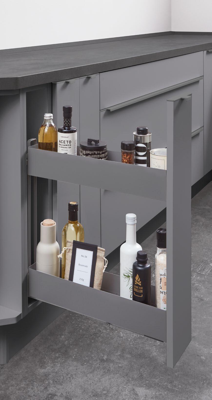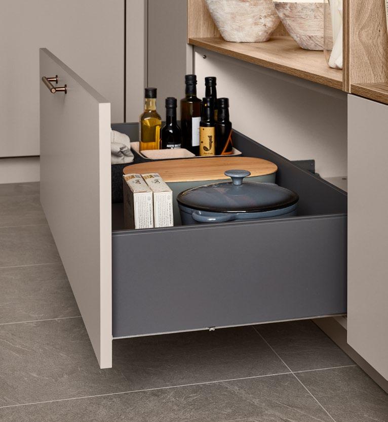 Our entire pull-out system and interior are characterised by a linear, minimalistic aesthetic in shape and colour. Whether as standard with a square railing, optionally with a glass side, glass panel or as a closed pull-out box: our multifaceted design options perfectly match your style and requirements. Add a personal touch with profiles and covers – subtle tone-on-tone or as a stylish contrast. It’s not just the appearance that impresses, but also the convenient features. Even with its high total load capacity of up to 70 kg, the nBOX offers smooth operation.