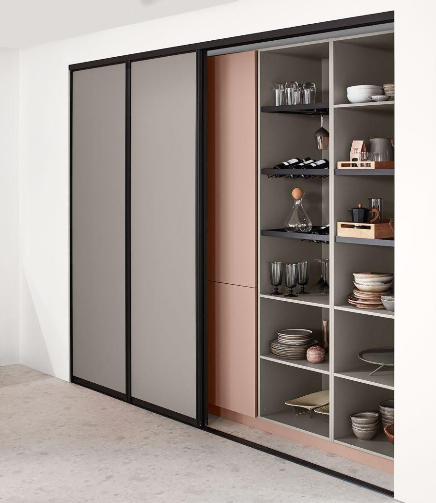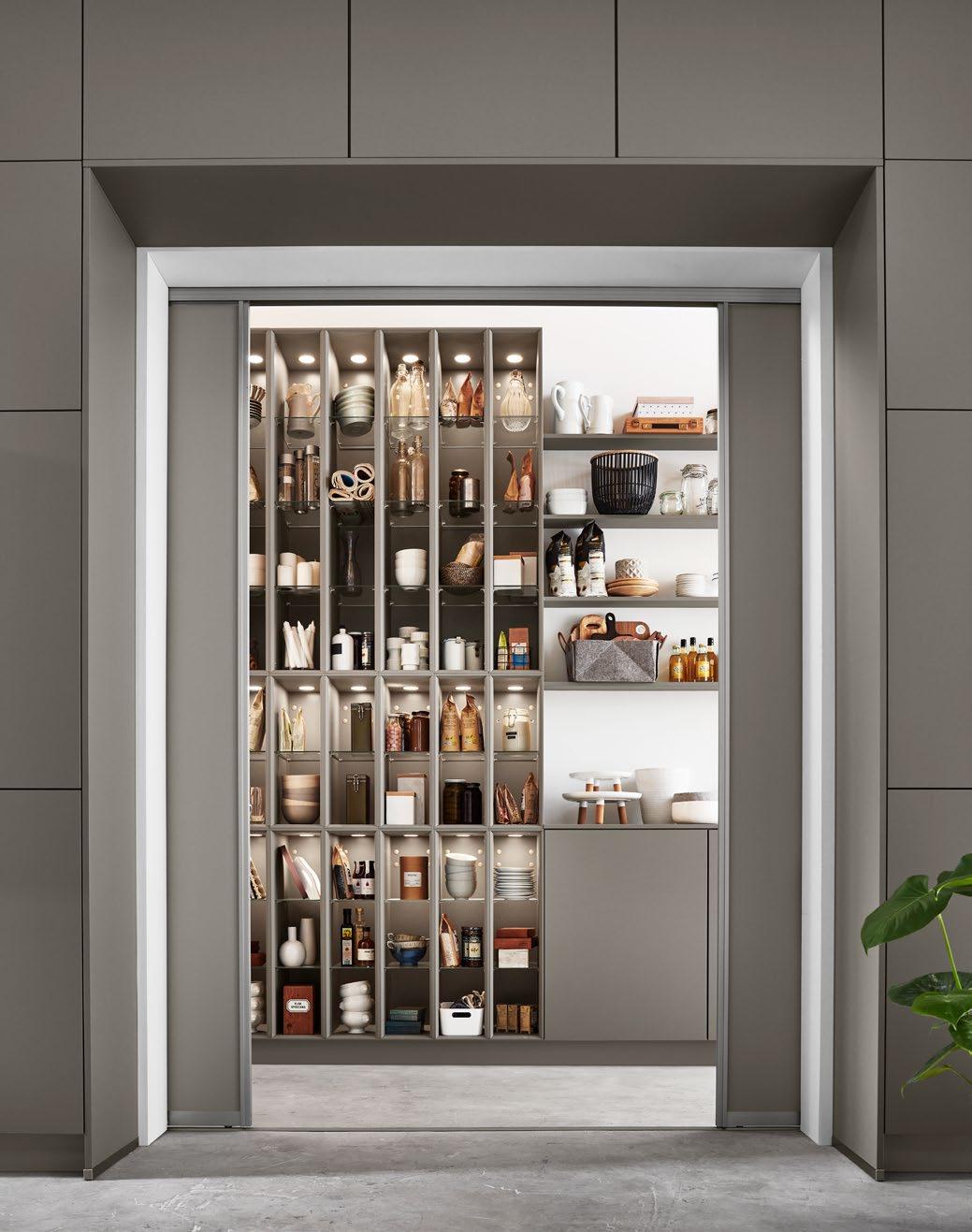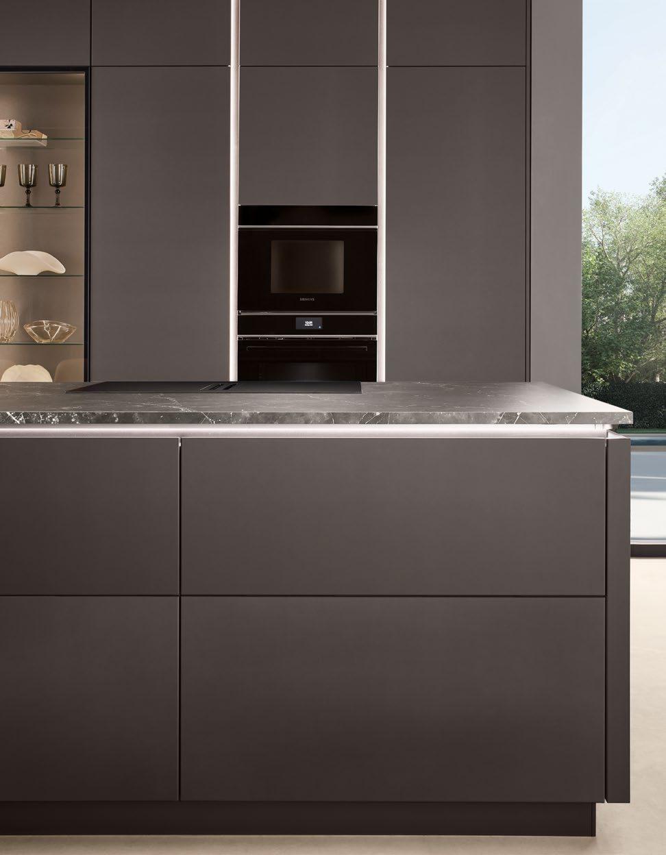 Vertical recessed handles accentuate the lines in floor-to-ceiling designs up to three metres tall and can be equipped with integrated lighting for a soft, atmospheric glow.