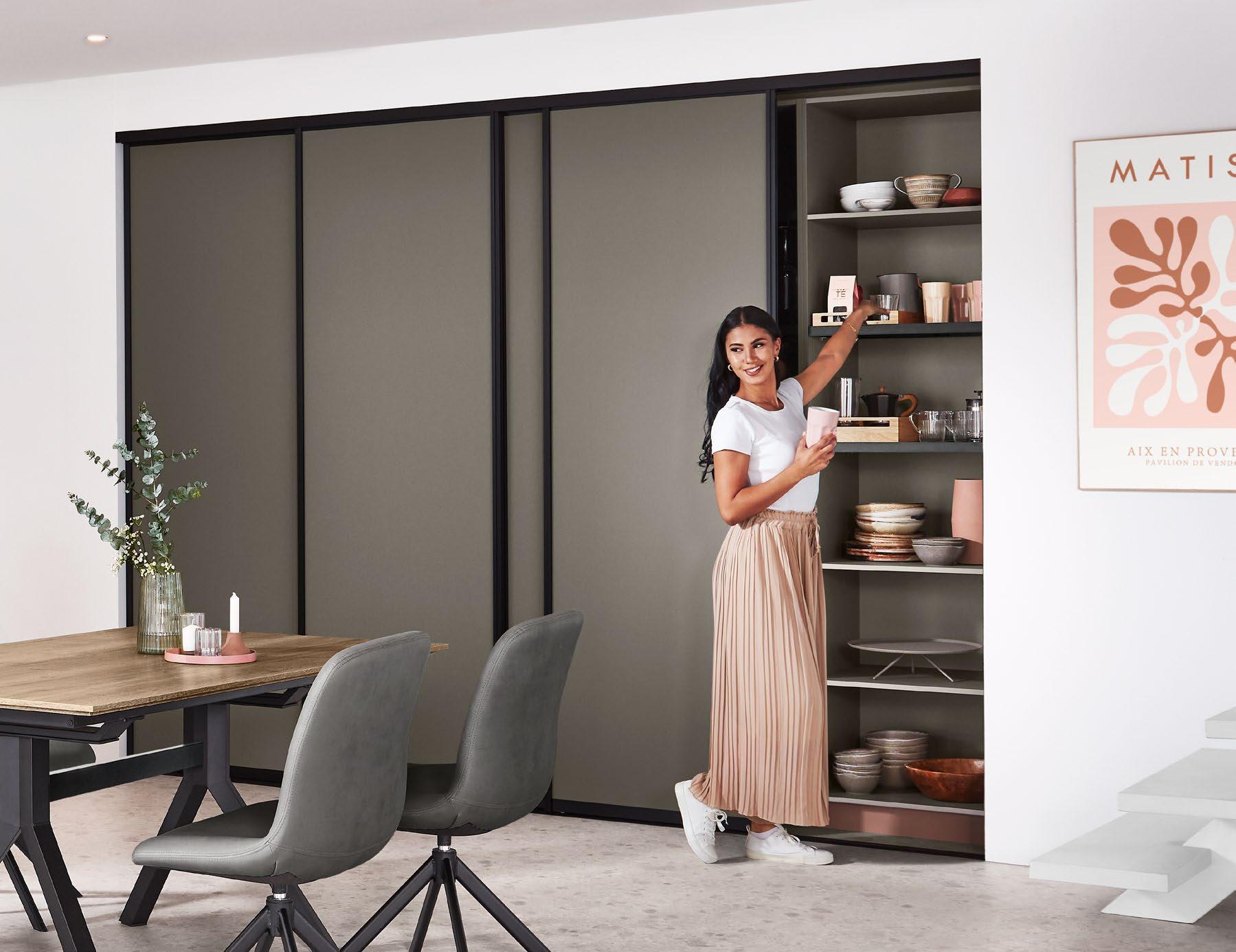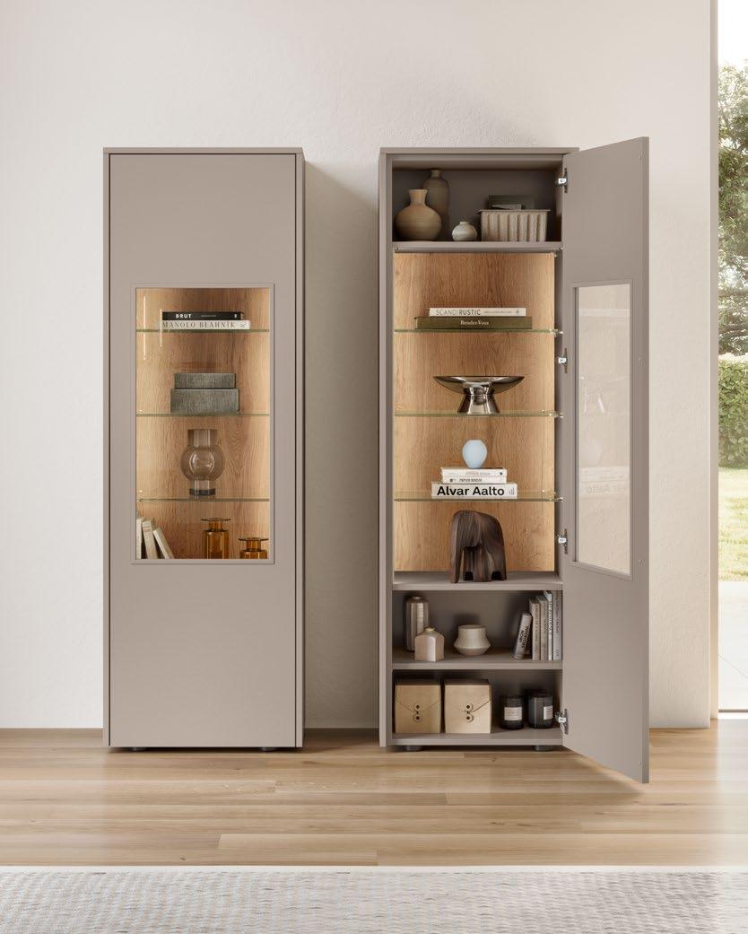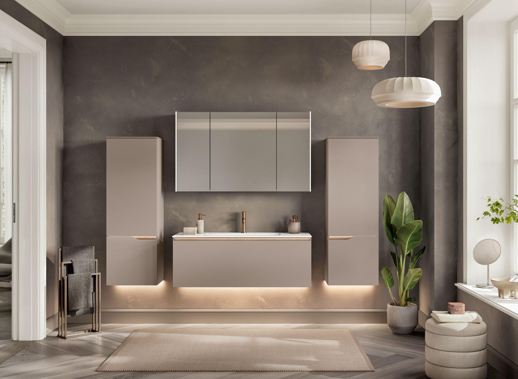 Vertical recessed handles accentuate the lines in floor-to-ceiling designs up to three metres tall and can be equipped with integrated lighting for a soft, atmospheric glow.