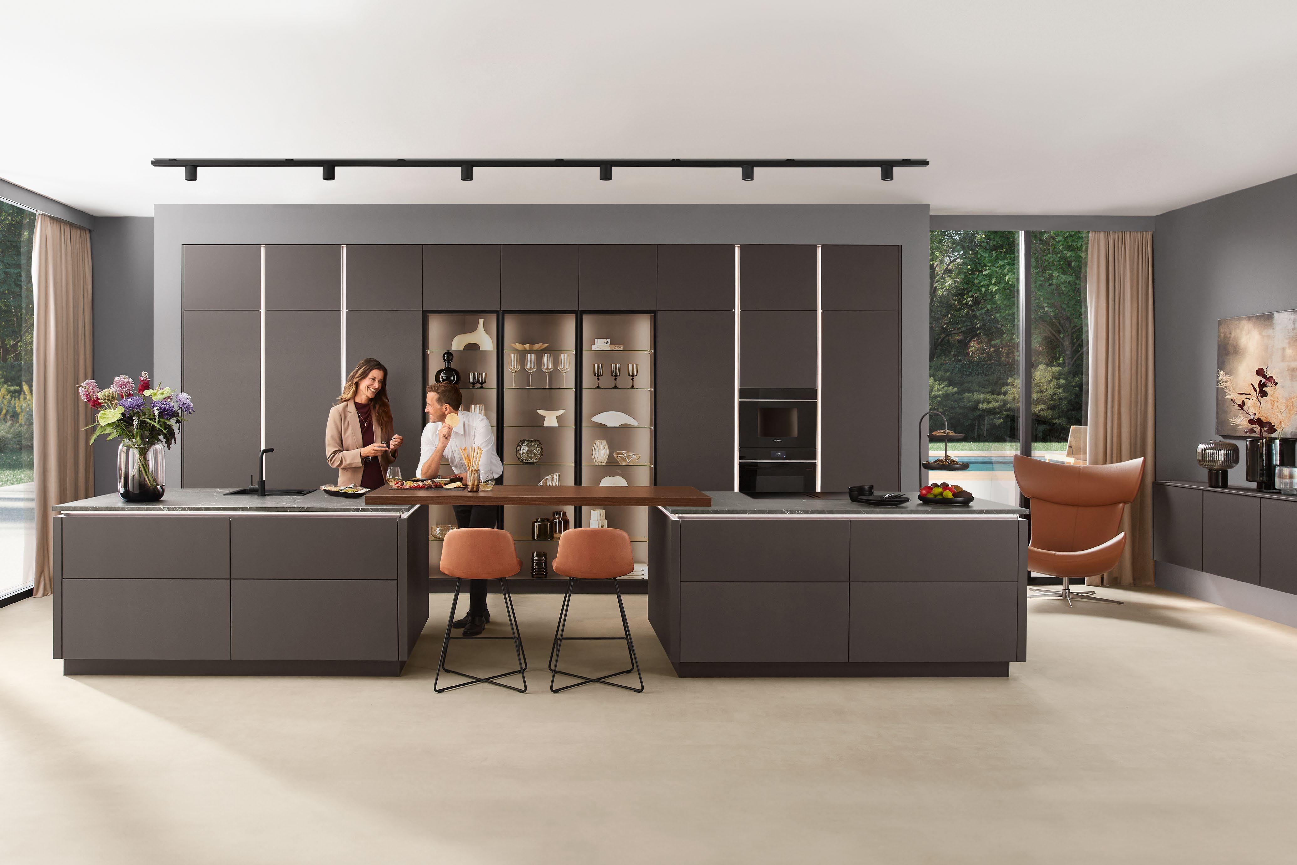 Diese Küche schafft einen geschmackvollen Rahmen, der zum entspannten Ausklang des Tages einlädt. Dunkel und edel in der Farbe Coffee gehalten, dabei wohltuend warm. Das großzügige Ambiente setzt auf klare, geradlinige Ästhetik und viel Freiraum zum Kochen. Zwei Kücheninseln bilden, zusammen mit der Thekenplatte als verbindendes Element, das Herzstück – offen, einladend, geschaffen für Gespräche und gemeinsame Momente.