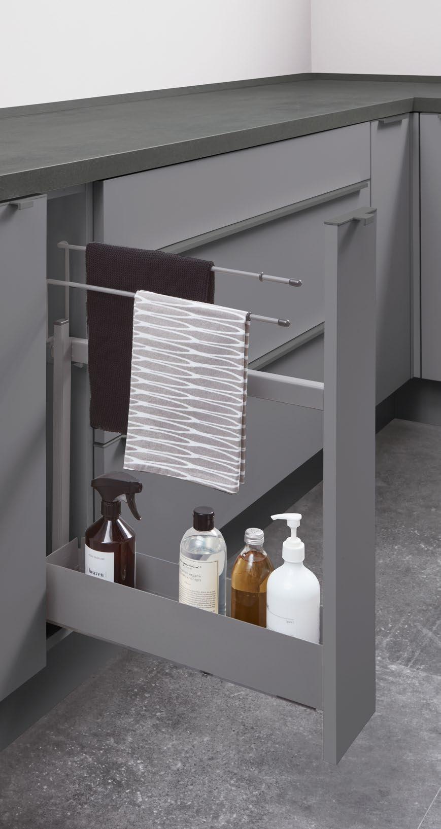 The nBOX impresses with its delicate lines, a striking, cubic design idiom and the narrow drawer frame of just 10.7 mm that gives the innovative drawer its puristic character. The sophisticated slate grey colour, which is also available for the interior, highlights the drawer’s timeless elegance. Ideal for a cohesive kitchen, bathroom and living room design.