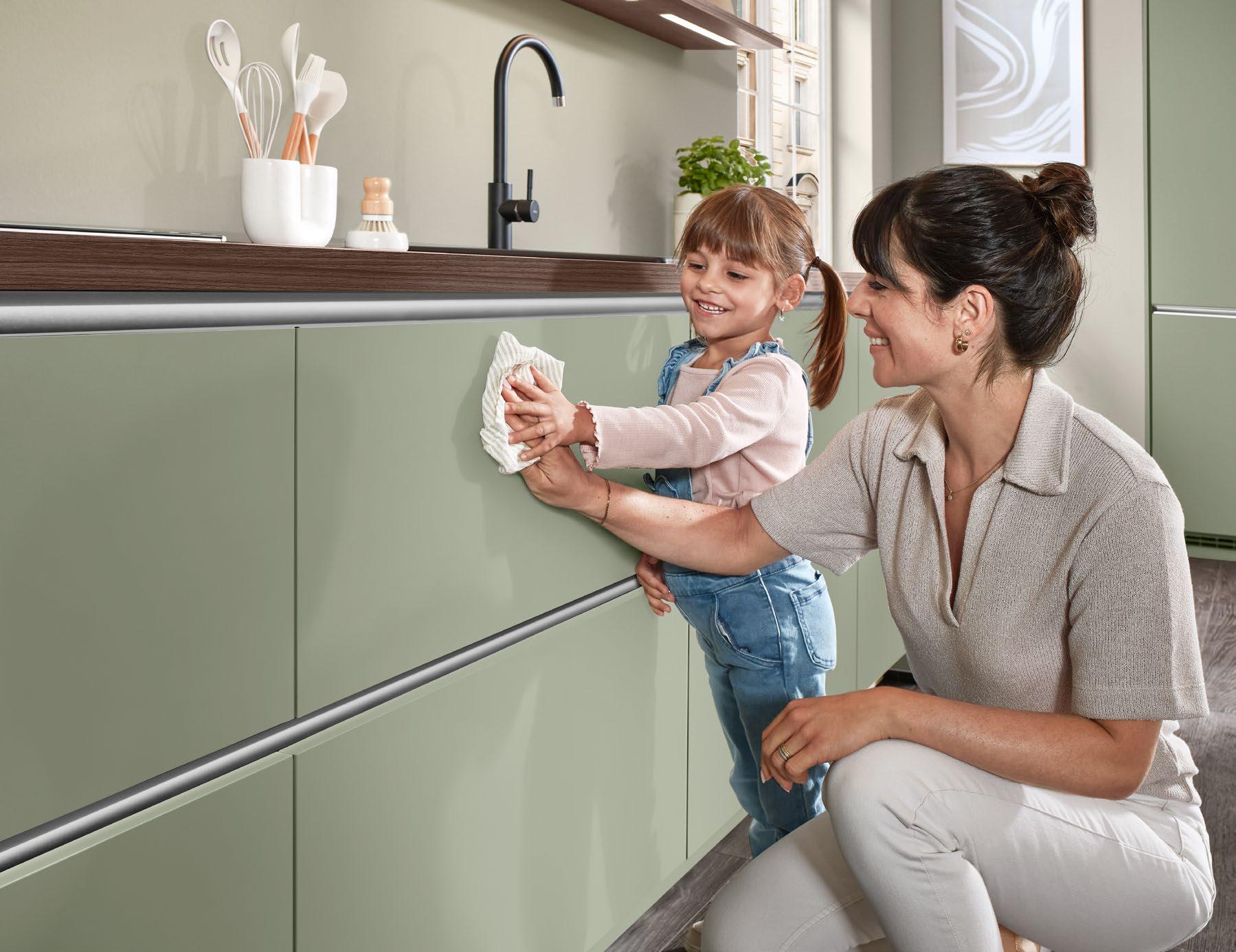 Bereits bei der Materialauswahl steht verantwortungsvolles Handeln für uns im Mittelpunkt. Wir verwenden daher nachhaltige, recycelbare Werkstoffe und beziehen viele Rohstoffe von regionalen Partnern. Unsere Holzwerkstoffe stammen überwiegend aus PEFC-zertifizierten Wäldern. Viele unserer Fronten tragen das Umweltzeichen „Blauer Engel“ – wie auch unsere besonders ressourcenschonende Anti-Fingerprint-Front aus 100 % recyceltem Material.