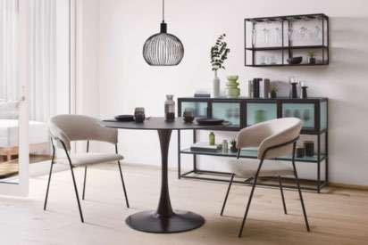 2 JEDILNA GARNITURA „WELS“, 5-delni komplet sestavljajo: JEDILNA MIZA, mizna plošča: kaljeno steklo v črni barvi, podnožje: prašno lakirana kovina v črni barvi, Š/V/G: ca. 120/75/80 cm in 4 JEDILNI STOLI, tkanina v sivi barvi, ogordje: kovina v črni barvi, maks. obremenitev: do 120 kg, Š/V/G: ca. 42/47/54 cm 199,- (16340010/02)