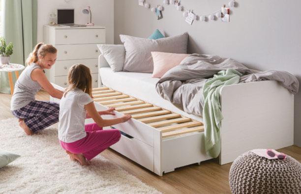 2 FUNKCIJSKA MLADINSKA POSTELJA „HONEY“, plošča MDF, lakirana v beli barvi, z okrasnimi zarezami, z dodatnim raztegljivim ležiščem, 2 predaloma za shranjevanje posteljnine in s fiksnim posteljnim dnom, površina ležišča: ca. 90/200 cm ali ca. 180/200 cm, brez vzmetnice, posteljnine in dekoracije 333,- (05320010/01) FUNKCIJSKA VZMETNICA „BEAUTY“, svetlo modra barva, jedro iz udobne pene, s funkcijo razprtja in 4-delnim setom blazin, višina vzmetnice: ca. 21 cm, površina ležišča: ca. 90/200 cm ali ca. 180/200 cm 229,(02980009/01)