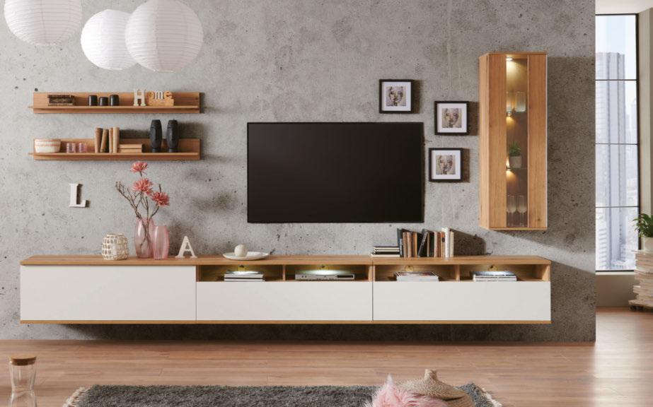 6 DNEVNI REGAL „LIDO“, korpus in poudarki: imitacija hrasta wotan, fronte: biserno bela barva, vklj. LEDosvetlitev, sestavni deli so: TV-element, vitrina, viseča vitrina in polica s hrbtnim delom, Š/V/G: ca. 235/190/38 cm 199,- (18030475/01)