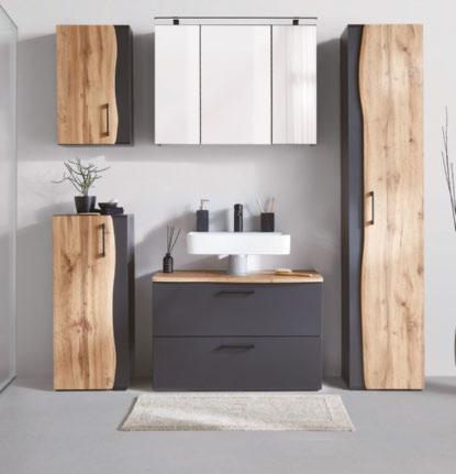 PROGRAM KOPALNIC „TIMBER“ s korpusom v temno sivi barvi, frontami v imitaciji hrasta wotan in kovinskimi ročaji v matirani črni barvi. Nesimetrične linije programu podeljujejo razgibanost in igrivost. VISOKA OMARA, vrata, 4 police, Š/V/G: ca. 40/194/35 cm 249,- OMARICA ZA POD UMIVALNIK, 2 predala, Š/V/G: ca. 90/61/45 cm 259,- OMARICA Z OGLEDALOM, 3 vrata, 6 polic, vklj. LED-osvetlitev in vtičnica, Š/V/G: ca. 90/65/220 cm 259,- (18030666/01-03)